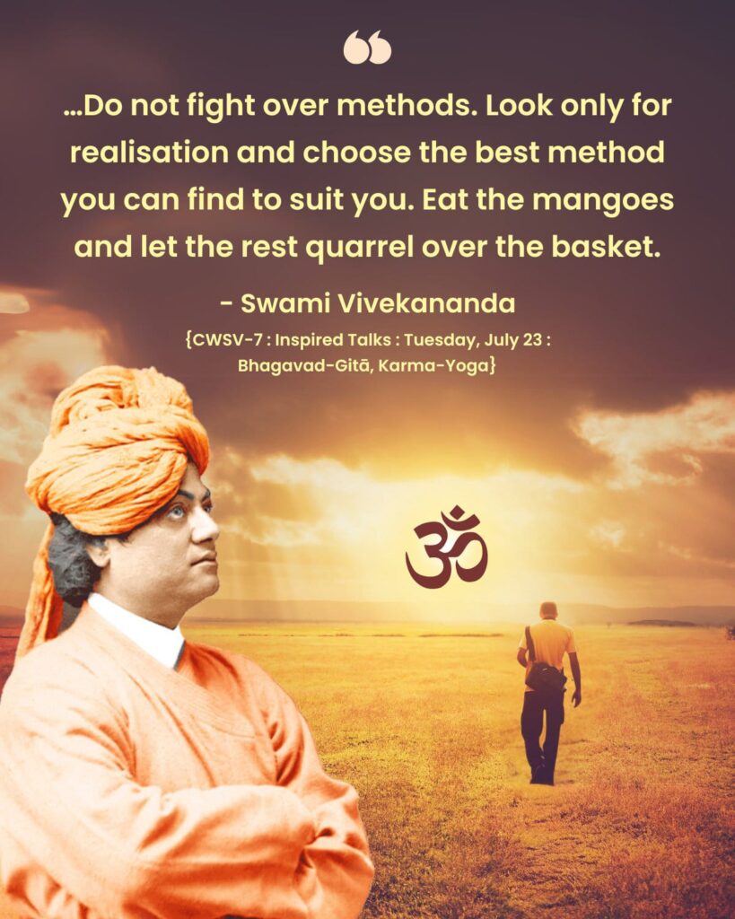 Swami Saradananda: “The Master came to make religion easy. People were being crushed under the weight of rules and regulations. To repeat the Lord’s name and to worship Him no special time and place are necessary. In whatever condition one may be, one can take His name. The Master never used to give too much importance to these external observances. As to means, adopt whichever suits you best. If you like God with form, that will also lead you to the goal. If you like God without form, well and good; stick to it and you will progress. If you doubt His very existence, then better put the question to Him thus: I do not know whether Thou existeth or not, whether Thou art formless or with form. Do Thou make known to me Thy real nature. As to changing of clothes, taking bath, and other external observances, if you can observe them, well and good; if not, go on calling on Him without paying much attention to all these. The Master once sang a song to me and told me, ‘Assimilate any one of these ideas and you will reach the goal.’ The song runs as follows :
