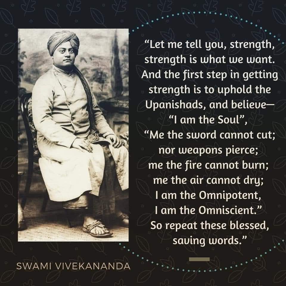 Let me tell you, strength, strength is what we want. And the first step in getting strength is to uphold the Upanishads, and believe — “I am the Soul”, “Me the sword cannot cut; nor weapons pierce; me the fire cannot burn; me the air cannot dry; I am the Omnipotent, I am the Omniscient.” So repeat these blessed, saving words. Do not say we are weak; we can do anything and everything. What can we not do? Everything can be done by us; we all have the same glorious soul, let us believe in it.[Source]