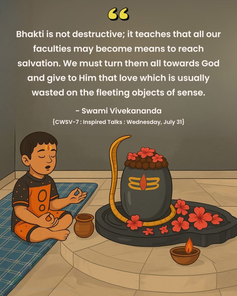 “Mere suppression of passions helps little. There must be a high ideal along with self-restraint. Without a high ideal, the passions will find another outlet. You must give them a new direction, then you will be automatically rid of them. “Take refuge in Me and control the senses.’ As for example, lust. Think that you are His child. Why should be so low you as to be lustful? Or think that you are ever pure.
