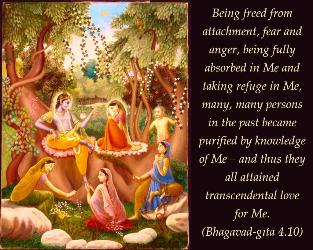 Free from desire, fear, and hatred, absorbed in Me, taking refuge in Me, many purified by the penance of knowledge have attained Me.