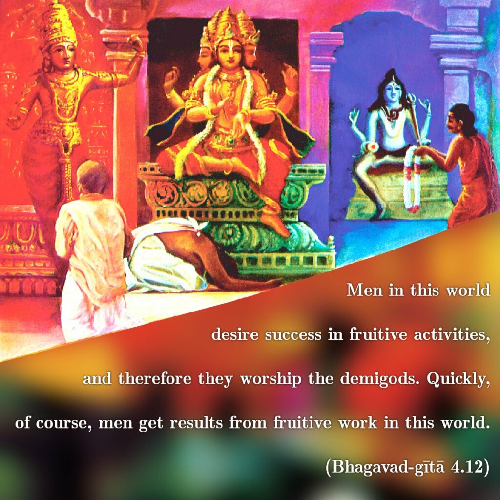 People longing for worldly success worship minor gods or angels, who also are manifestations of the Lord. But on account of their selfish motives, their mode of worship is characterized by the attitude that the devotee and the god are two different beings. “He who, on the other hand, worships a separate god, thinking, ‘He is separate from me and I am separate from him’— he knows not. He is to the gods as cattle are to men.” (Brihadāranyaka Upanishad, I, iv, 10) Worldly success is quickly and easily attained, but not so Self-knowledge. Therefore people do not seek the latter.
