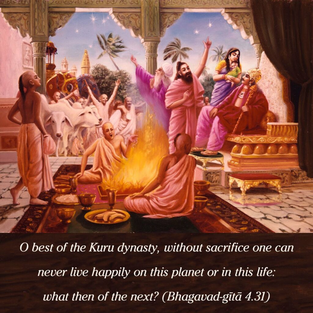 The non- sacrificer loses both worlds. What enjoyment or happiness or joy can he have even in this world? Indisciplined men who have neither will nor knowledge cannot hope to make anything even in this earthly life. It is all misery, doubt and despair for them, and such men proceed from sorrow to sorrow. It should be understood that success in attaining purity is also the fruit of sacrifice (i.e.,) the result of self-discipline and proper action. If one cannot do this, how can one hope to enter a higher world? The Lord calls on mankind – “O ye mortal beings! Having attained this human birth, if you do nothing for your spiritual uplift, you cannot get anything even in this life, much less in the next world.”