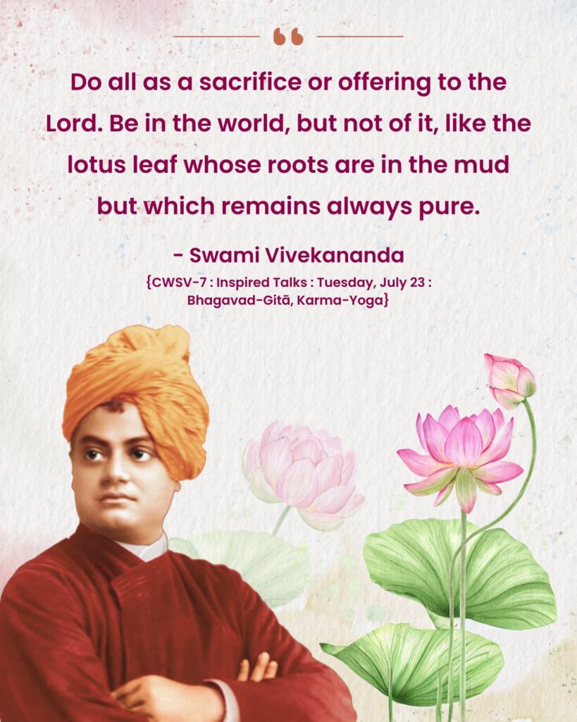“Whosoever lives in the midst of the world, and works, and gives up all the fruit of his action unto the Lord, he is never touched with the evils of the world. Just as the lotus, born under the water, rises up and blossoms above the water, even so is the man who is engaged in the activities of the world, giving up all the fruit of his activities unto the Lord.”[Source]