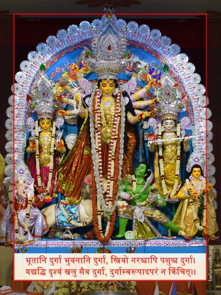 Every place is Durga, every being is Durga, every woman, man and animal is Durga. Whatever we see are all Durga. There is nothing other than Durga. (This Mantra is Chanted during Durga Worship in Belur Math)