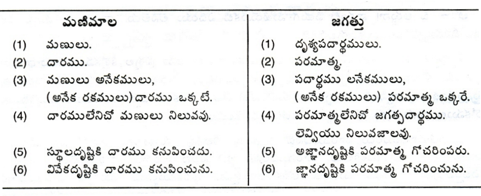 ఒక రత్నాల హారంలో దారం లేకపోతే రత్నాలు (పూసలు) నిలబడవు. ఆ రత్నాలకు దారమే ఆధారం. రత్నాలకు తమంతట తాముగా నిలబడే శక్తి లేదు, కేవలం దారం వల్లనే అవి ఒకచోట ఉంటాయి. దారం లేకపోతే అవన్నీ చెల్లాచెదురైపోతాయి. అలాగే, రత్నాలు ఎన్నో ఉండవచ్చు, రకరకాలుగా ఉండవచ్చు. కానీ వాటన్నింటిలో ఉండే దారం మాత్రం ఒక్కటే. ఈ ప్రపంచంలో ఉన్న రకరకాల జీవులు, ప్రాణులన్నీ ఆ రత్నాల లాంటివి. దేవుడు (పరమాత్మ) ఆ రత్నాల్లోని దారం లాంటివాడు. దేవుడే లేకపోతే ఈ ప్రాణులెవరూ ఉండలేరు. అందరినీ కలిపి ఉంచేది, అందరిలోనూ ఉండేది ఆ భగవంతుడే. ఆయన ఆధారంతోనే ప్రపంచం నడుస్తోంది. మనం హారాన్ని చూసినప్పుడు పైకి రత్నాలు మాత్రమే కనిపిస్తాయి తప్ప, లోపల ఉన్న దారం కనిపించదు. దాన్ని గుర్తించాలంటే సూక్ష్మ దృష్టి కావాలి. అలాగే, దేవుడు కూడా మన మామూలు కళ్ళకు (చర్మ చక్షువులకు) కనిపించడు. ఆయనను చూడాలంటే జ్ఞానం అనే కన్ను (జ్ఞాననేత్రం) కావాలి.