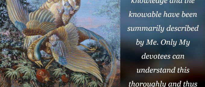 इति क्षेत्रं तथा ज्ञानं ज्ञेयं चोक्तं समासत: |मद्भक्त एतद्विज्ञाय मद्भावायोपपद्यते || 19|| iti kṣhetraṁ tathā jñānaṁ jñeyaṁ choktaṁ samāsataḥmad-bhakta etad vijñāya …