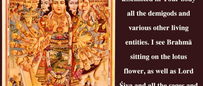 अनादिमध्यान्तमनन्तवीर्य-मनन्तबाहुं शशिसूर्यनेत्रम् |पश्यामि त्वां दीप्तहुताशवक्त्रं-स्वतेजसा विश्वमिदं तपन्तम् || 19|| anādi-madhyāntam ananta-vīryamananta-bāhuṁ śhaśhi-sūrya-netrampaśhyāmi tvāṁ …