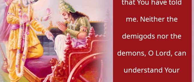 सर्वमेतदृतं मन्ये यन्मां वदसि केशव |न हि ते भगवन्व्यक्तिं विदुर्देवा न दानवा: || 14|| sarvam etad ṛitaṁ manye yan māṁ vadasi keśhavana hi te bhagavan vyaktiṁ vidur devā na …