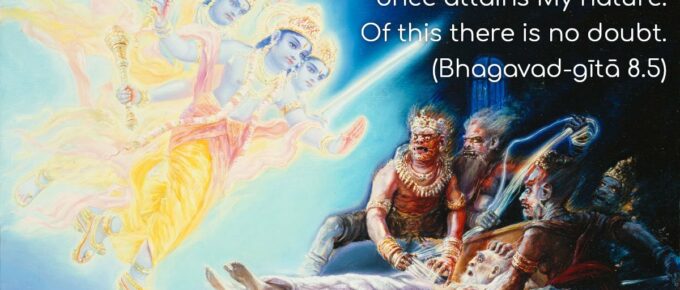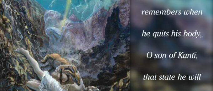 अन्तकाले च मामेव स्मरन्मुक्त्वा कलेवरम् |य: प्रयाति स मद्भावं याति नास्त्यत्र संशय: || 5|| anta-kāle cha mām eva smaran muktvā kalevaramyaḥ prayāti sa mad-bhāvaṁ yāti nāstyatra …