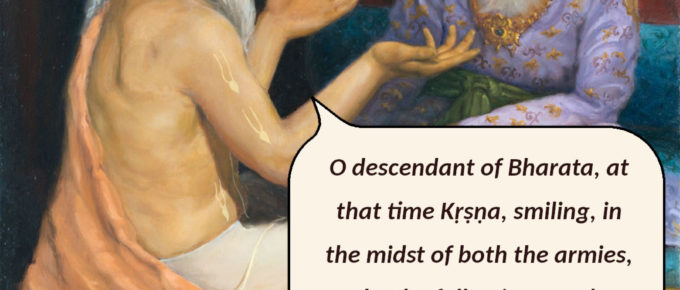 तमुवाच हृषीकेश: प्रहसन्निव भारत |सेनयोरुभयोर्मध्ये विषीदन्तमिदं वच: || 10|| tam-uvācha hṛiṣhīkeśhaḥ prahasanniva bhāratasenayorubhayor-madhye viṣhīdantam-idaṁ vachaḥ tam—to him; uvācha—said; …
