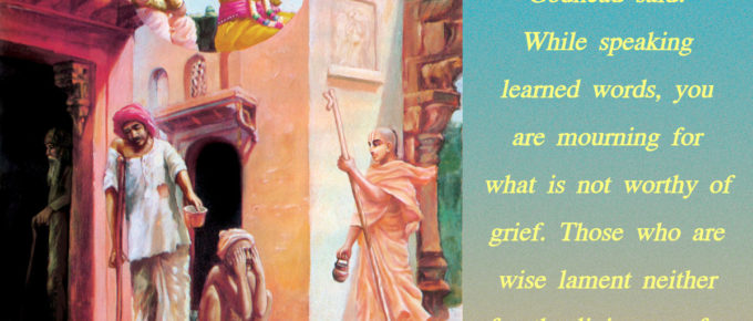 श्रीभगवानुवाच |अशोच्यानन्वशोचस्त्वं प्रज्ञावादांश्च भाषसे |गतासूनगतासूंश्च नानुशोचन्ति पण्डिता: || 11|| śhrī bhagavān uvāchaaśhochyān-anvaśhochas-tvaṁ prajñā-vādānśh cha …