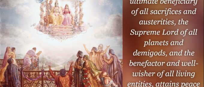 भोक्तारं यज्ञतपसां सर्वलोकमहेश्वरम् |सुहृदं सर्वभूतानां ज्ञात्वा मां शान्तिमृच्छति || 29|| bhoktāraṁ yajña-tapasāṁ sarva-loka-maheśhvaramsuhṛidaṁ sarva-bhūtānāṁ jñātvā māṁ śhāntim …