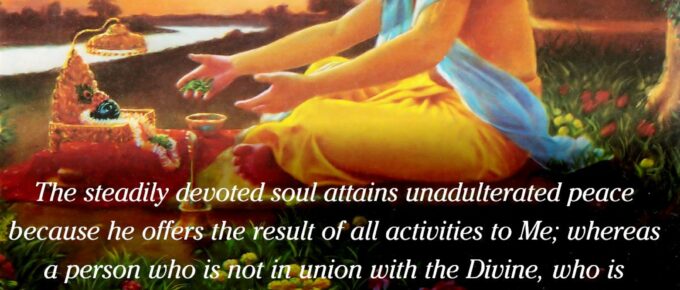 युक्त: कर्मफलं त्यक्त्वा शान्तिमाप्नोति नैष्ठिकीम् |अयुक्त: कामकारेण फले सक्तो निबध्यते || 12|| yuktaḥ karma-phalaṁ tyaktvā śhāntim āpnoti naiṣhṭhikīmayuktaḥ kāma-kāreṇa phale sakto …