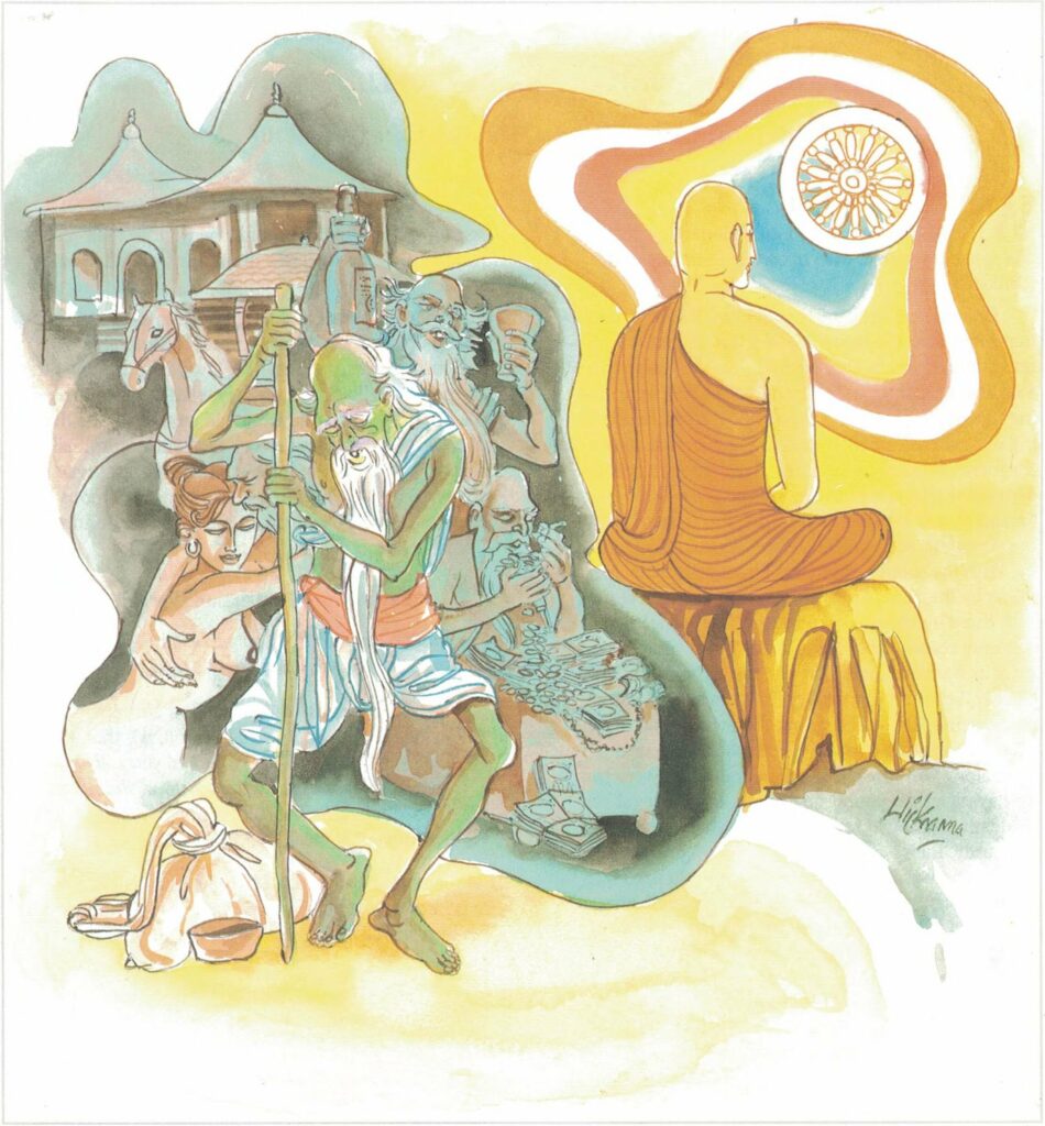 Accompanied by those monks, he went to the Buddha. When the Buddha asked him, “Koṇḍañña, you have obtained pupils?” he told him what had happened. The Buddha asked, “Monks, is this true?” “Yes, Venerable; we never saw such an exhibition of magical power before and therefore we have become monks.” The Buddha replied, “Monks, it were better for you to live but a single day in the exercise of the wisdom you have just acquired than to live for a hundred years committing such acts of foolishness.”