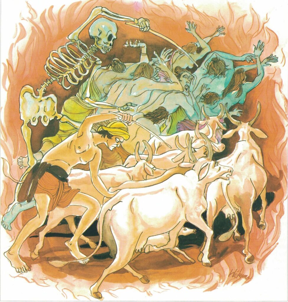 The cowherd drives the cattle along to the pasture with the goad. In the same way, decay and death drive the life-span of beings.