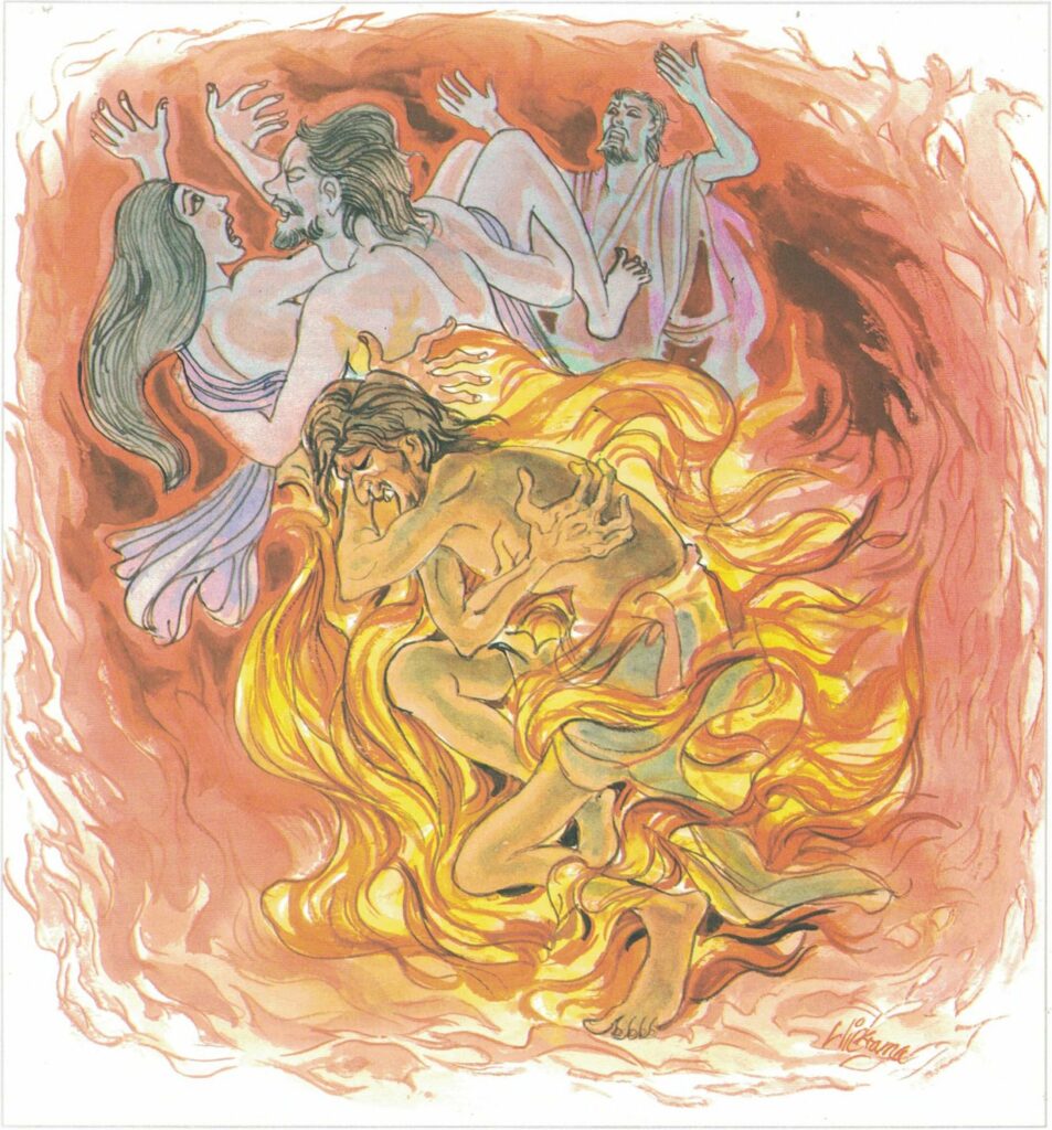 But, in spite of all this, he was unable to satisfy his grudge against the treasurer. So he made friends with the treasurer’s page and asked him, “What is your master the treasurer especially fond of?” “There is nothing he thinks more of than the perfumed chamber,” replied the page. “Very well,” thought the thief, “I will burn up the perfumed chamber and thus satisfy my grudge.” Accordingly, when the Buddha entered the city for alms he broke all the vessels used for drinking and eating and set fire to the perfumed chamber. When the treasurer heard the cry, “The perfumed chamber is on fire!” he immediately went there, but before he arrived at the perfumed chamber it had burned to the ground. The treasurer rebuilt the monastery and pardoned the thief for his crimes. The thief was reborn as the peta-ghost.