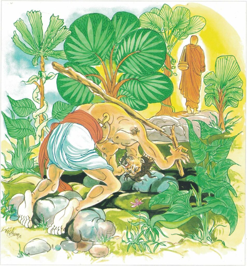 Venerable Moggallāna: These four stanzas relate to the demise, under tragic circumstances, of the Chief Disciple Moggallāna. If Sāriputta could be regarded as the Chief Disciple on the right of Buddha, Moggallāna was the Chief Disciple on His left. They were born on the same day and were associated with each other during many previous lives; so were they during the last life. It is one of the oldest recorded friendships in the world. Venerable Moggallāna was foremost in the noble Sangha in psychic power. Once a king of cobras called Nandopananda, also noted for psychic feats, was threatening the Buddha and some arahats. The Buddha was besieged with offers from various members of the noble sangha to subdue the snake king. At last Venerable Moggallāna’s turn came and the Buddha readily assented. He knew he was equal to the task The result was a psychic confrontation with the Naga King who was worsted and he begged for peace. The Buddha was present throughout the encounter.