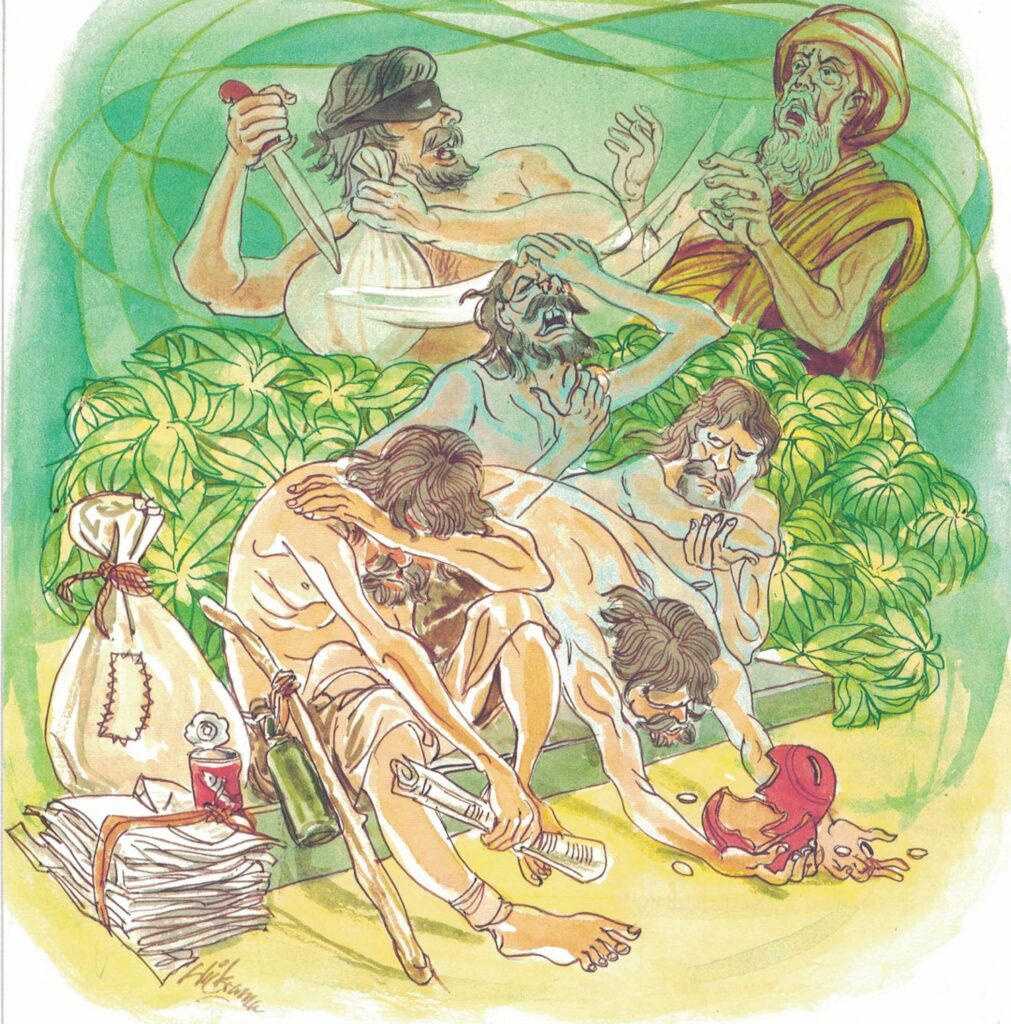 As he did so, he began to make a noise, increasing the volume of the noise until it sounded as if a band of thieves were about to make an attack. When his mother and father heard the noise, they thought to themselves, “A band of thieves are about to attack us.” Therefore they said to their son, “Son, we are old people; save yourself, and pay no attention to us.” But even as his mother and father cried out thus, the son, yelling the thieves’ yell, beat them and killed them and threw their bodies into the forest. Having so done, he returned home.