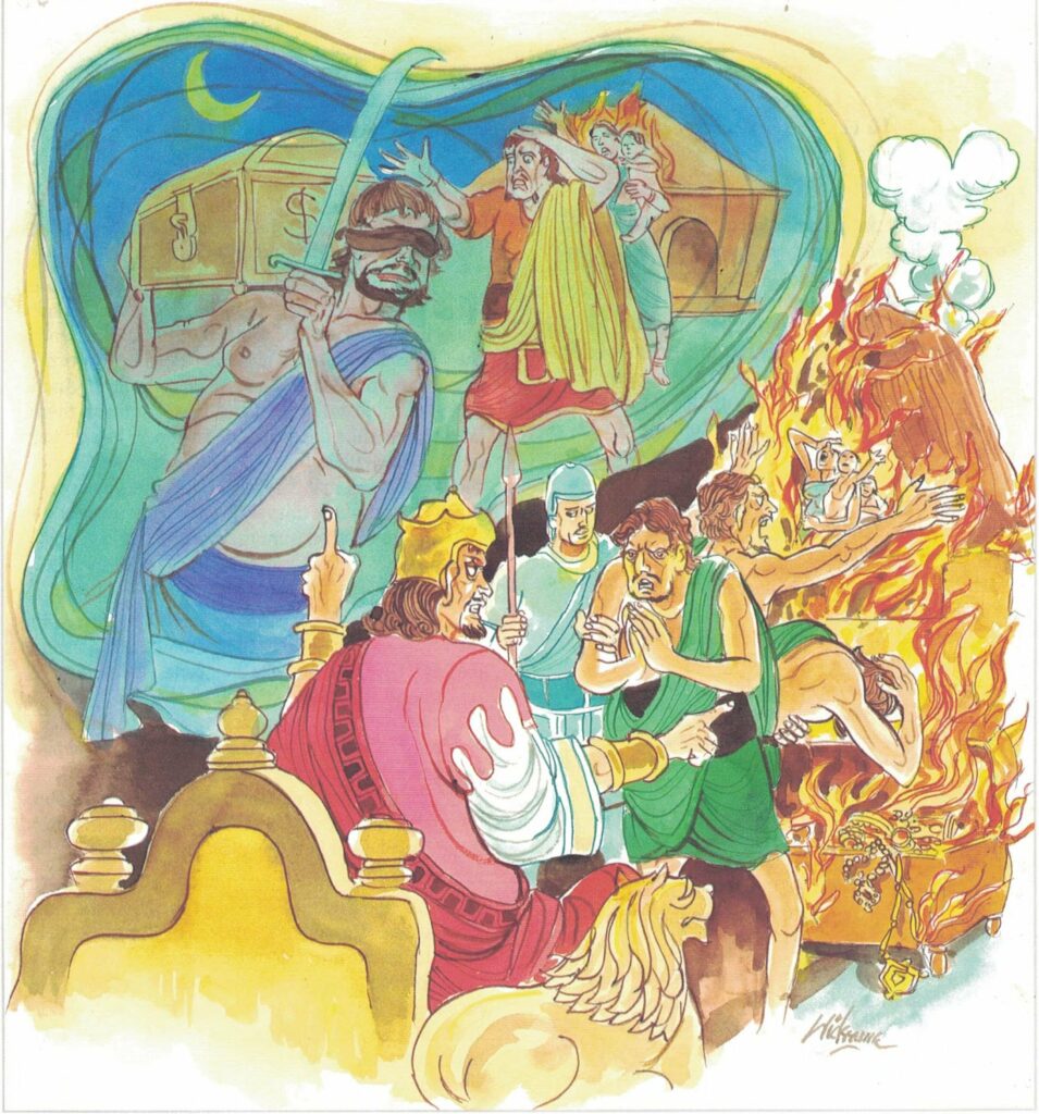 Those spies heard what the thieves said, captured all the thieves, and made their report to the king. The king caused the thieves to be brought into his presence and asked them, “Was it you that killed the Venerable?” “Yes, your majesty.” “Who, pray, put you up to it?” “The naked ascetics, your majesty,” The king had the five hundred naked ascetics caught, placed them, together with the five hundred thieves, waist-deep in pits which he had dug in the palace-court, caused their bodies to be covered over with bundles of straw, and then caused the bundles of straw to be lighted. When he knew that they had been burned, he caused their bodies to be plowed with iron plows and thus caused them all to be ground to bits.
