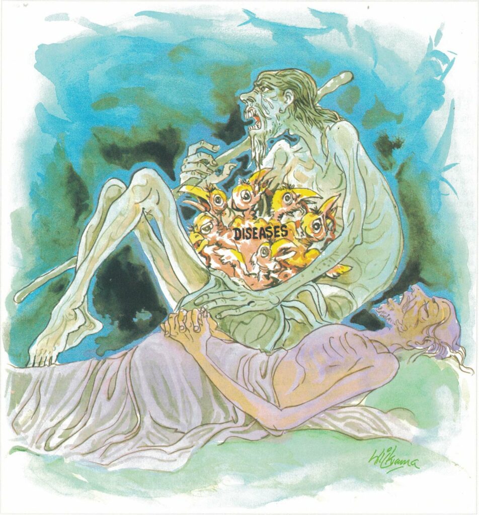 This form–this body–is fully broken down. It is truly a den of diseases. It disintegrates easily. Out of its nine orifices, putrid matter oozes constantly. It breaks apart. Death puts an end to it.