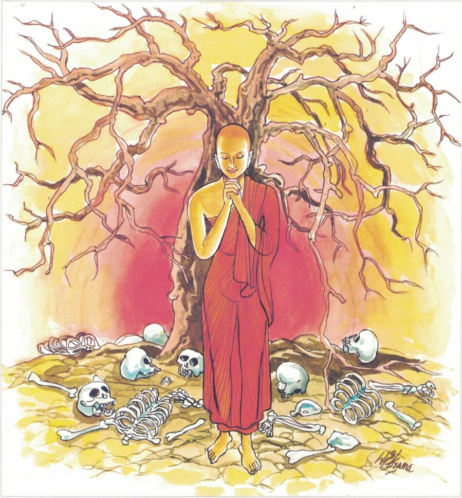 When they arrived at the outer gate of the Monastery, the Buddha said to the Venerable Ānanda, “Those monks will not benefit much by coming to see me now;let them go to the cemetery first and come to see me only afterwards.” The Venerable Ānanda then delivered the message of the Buddha to those monks, and they reflected, “The Buddha knows everything; he must have some reason in making us go to the cemetery first.” So they went to the cemetery.