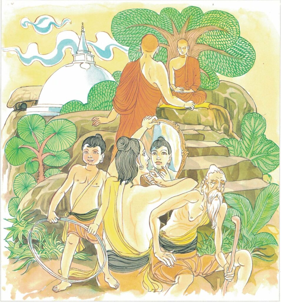 In one of their past existences, the prince and his wife were the sole survivors of a shipwreck. They were stranded on a deserted island, and there they lived by eating birds’ eggs, fledglings and birds, without any feeling of remorse at any time. For that evil deed, they would not be blessed with any children. If they had felt even a slight remorse for their deed at any stage of their lives, they could have a child or two in this existence. Then turning to the prince, the Buddha said, “One who loves himself should guard himself in all stages of life, or at least, during one stage in his life.”