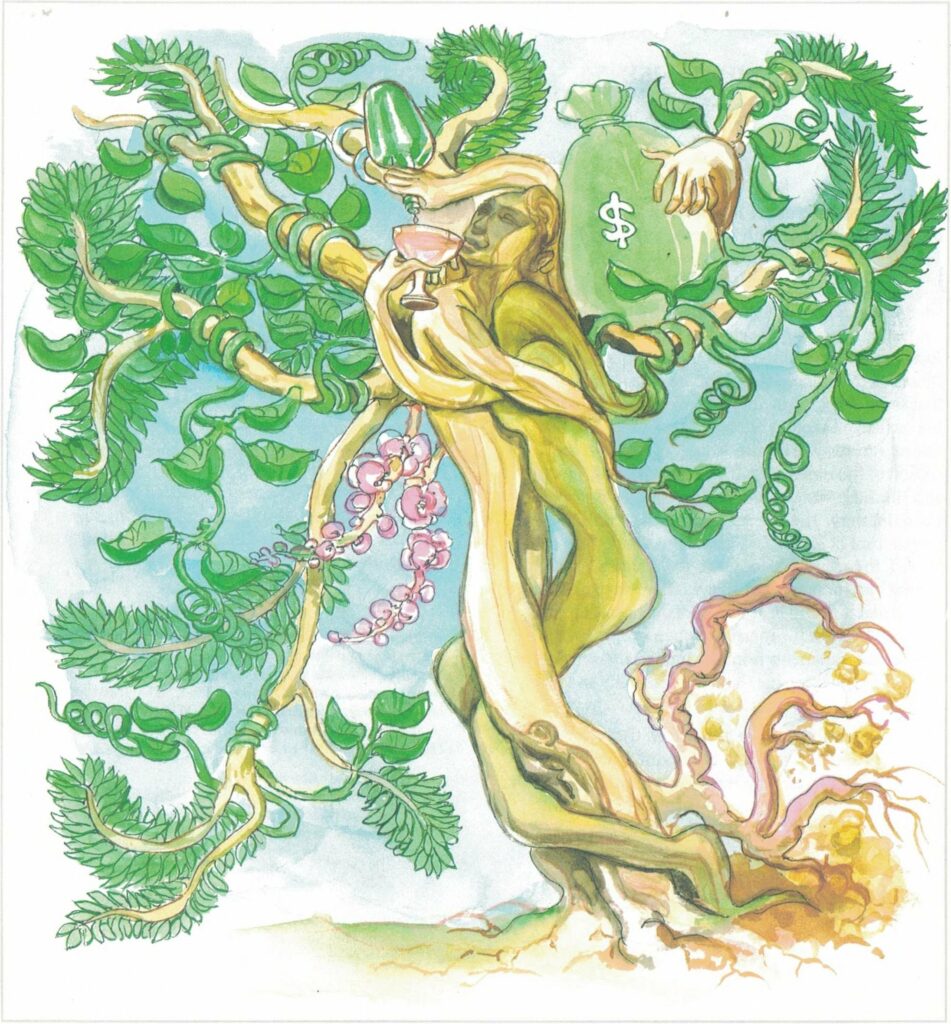 The extremely evil action of the person lacking in virtue is similar to that of the parasitic māluvā creeper. The creeper grows on the tree and crushes it into destruction. The evil doer’s action too crushes himself in that way.