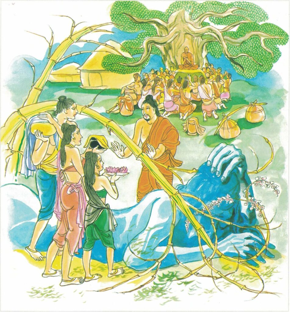 Once in Sāvatthi, an elderly woman was looking after a monk named Kāla, like her own son. One day, hearing from her neighbours about the virtues of the Buddha, she wished very much to go to the Jetavana Monastery and listen to the discourses given by the Buddha. So she told Venerable Kāla about her wishes;but the monk advised her against it. Three times she spoke to him about her wishes but he always dissuaded her. But one day, in spite of his dissuasions, the lady decided to go. After asking her daughter to look to the needs of Venerable Kāla she left the house. When Venerable Kāla came on his usual round of alms-food, he learned that the lady of the house had left for the Jetavana Monastery. Then he reflected, “It is quite possible that the lady of this house is losing her faith in me.” So, he made haste and quickly followed her to the monastery. there, he found her listening to the discourse being given by the Buddha. He approached the Buddha respectfully, and said, “Venerable! This woman is very dull; she will not be able to understand the sublime Dhamma; please teach her only about charity (dāna) and morality (sīla).