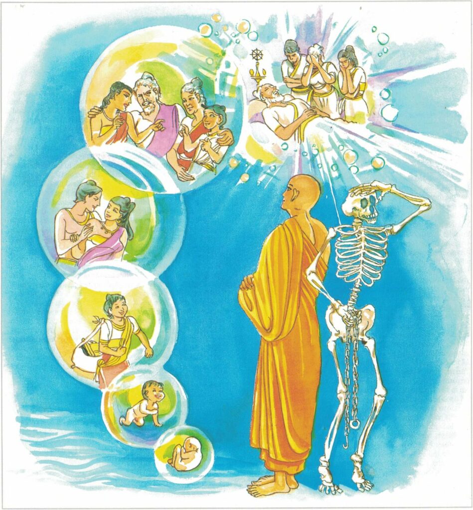On one occasion, a large number of monks, after taking a meditation topic from the Buddha, went into the forest to practice meditation. But they made very little progress: so they returned to the Buddha to ask for a more suitable subject of meditation. On their way to the Buddha, seeing a mirage they meditated on it. As soon as they entered the compound of the monastery, a storm broke out: as big drops of rain fell, bubbles were formed on the ground and soon disappeared. Seeing those bubbles, the monks stated, “This body of ours is perishable like the bubbles… and perceived the impermanent nature of the aggregates (khandhas). At the end of the discourse, the monks attained arahatship.