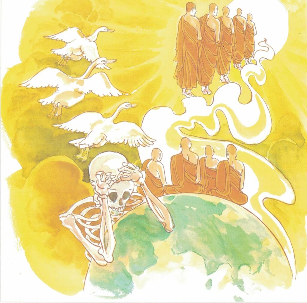 The swans fly away in the sky–as the path of the sun. Those possessing psychic power travel through the sky. Those diligent, wise saints conquer death with his armies and leave the world and reach Nibbāna.