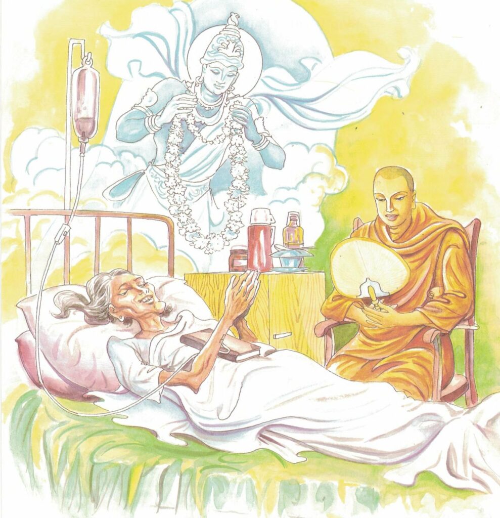 “Where has she now been reborn, Venerable?” In the World of the Tusita gods, householder.” “Venerable, while my daughter remained here among her kinsfolk, she went about rejoicing, and when she went hence, she was reborn in the Deva world.” Then the Buddha said to him, “It is even so householder. They that are heedful, be they lay folk or religious, rejoice both in this world and in the world beyond.”