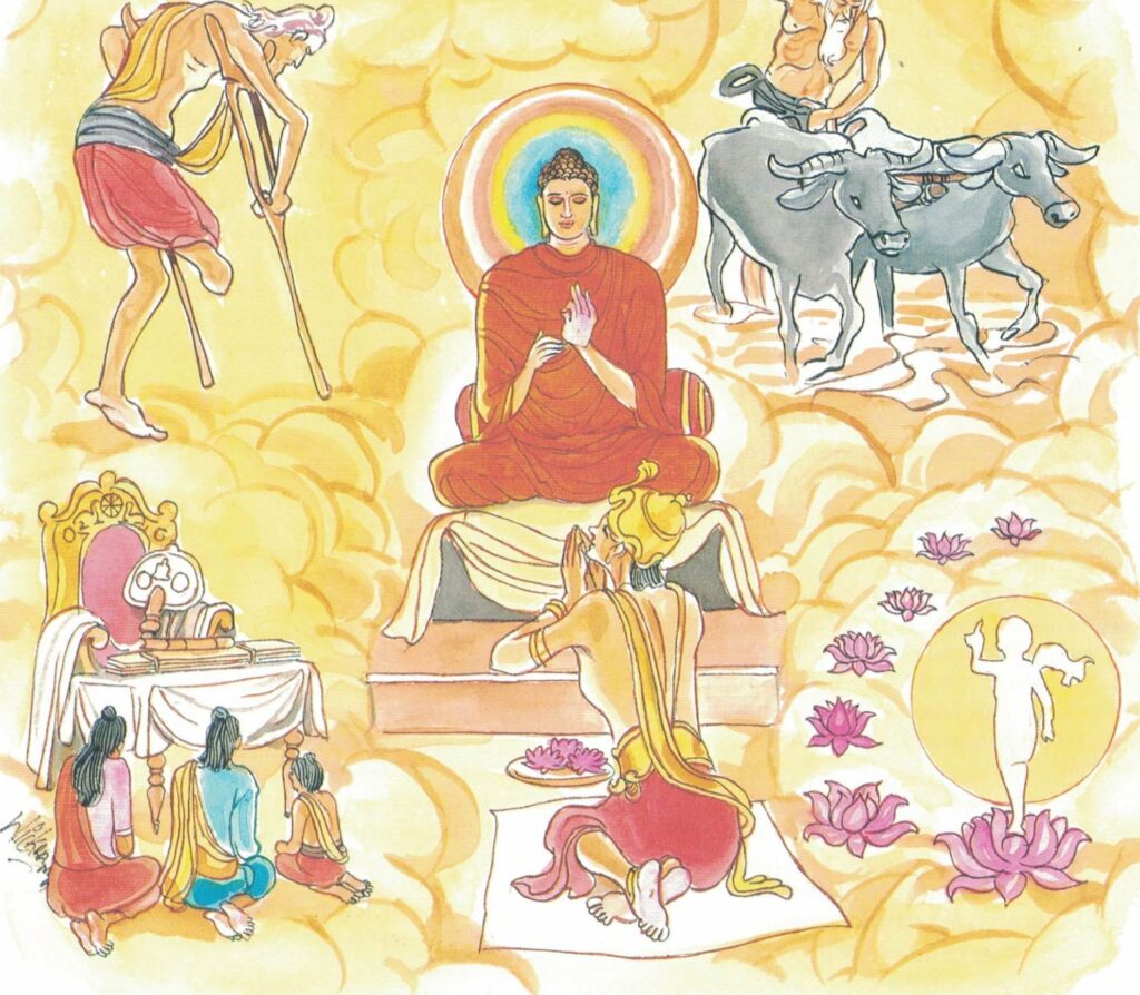 Having had the correct answers to the above, the nāga princess sang out questions regarding the floods (oghas) of sensual desire, of renewed existence, of false doctrine and of ignorance, and how they could be overcome. Uttara answered these questions as taught by the Buddha. When Erakapatta heard these answers he knew that a Buddha had appeared in this world. So he asked Uttara to take him to the Buddha. On seeing the Buddha, Erakapatta related to the Buddha how he had been a monk during the time of Kassapa Buddha, how he had accidentally caused a grass blade to be broken off while travelling in a boat, and how he had worried over that little offence for having failed to do the act of exoneration as prescribed, and finally how he was reborn as a nāga. After hearing him, the Buddha told him how difficult it was to be born in the human world, and to be born during the appearance of the Buddhas or during the time of their teaching.