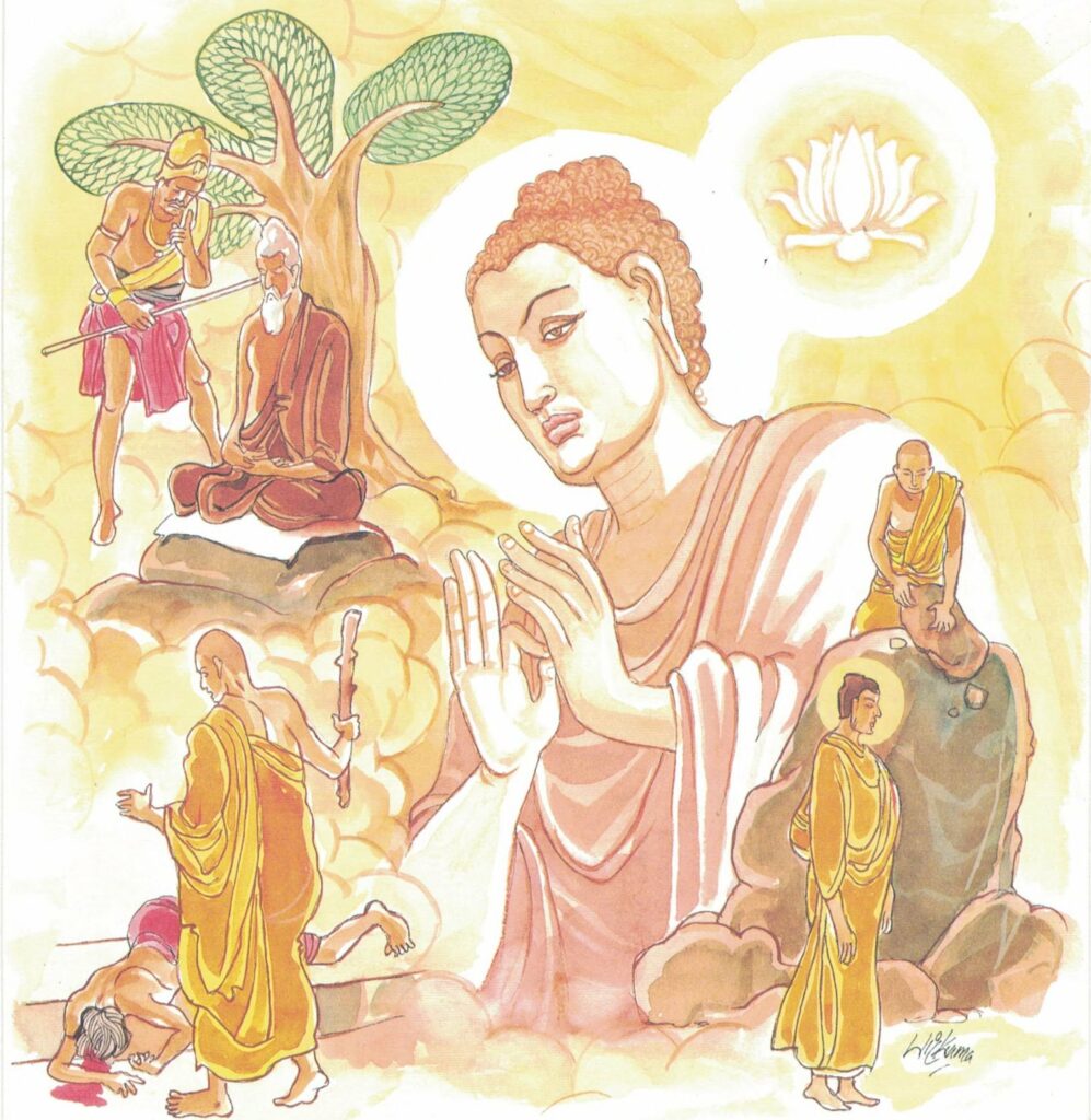 It may be mentioned that a Bodhisatta is not irritated by any man’s shameless conduct either. Admonishing His disciples to practise forbearance, the Buddha said in the Kakacūpama Sutta–“Though robbers, who are highway men, should sever your limbs with a two-handled saw yet if you thereby defile your mind, you would be no follower of my teaching. Thus should you train yourselves: Unsullied shall our hearts remain. No evil word shall escape our lips. Kind and compassionate with loving-heart, harbouring no ill-will shall we abide, enfolding even these bandits with thoughts of loving-kindness. And forth from them proceeding, we shall abide radiating the whole world with thoughts of loving-kindness, expansive, measureless, benevolent and unified.”