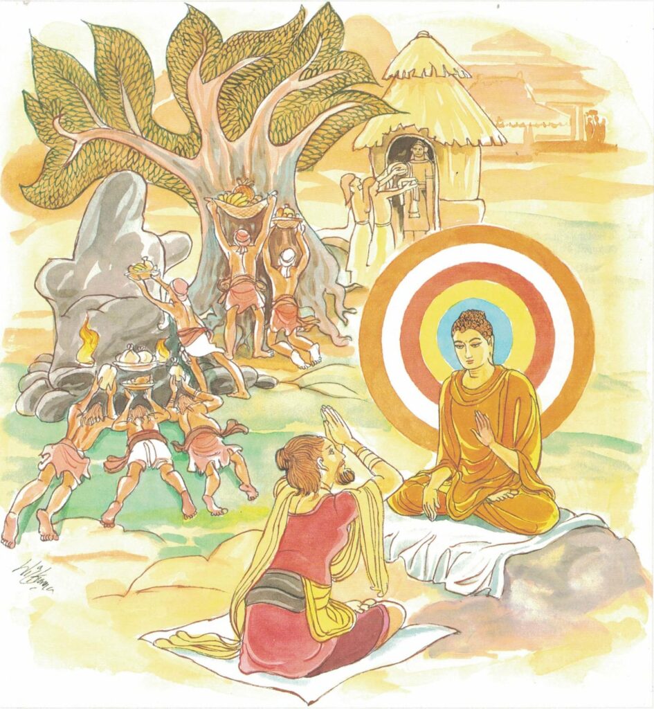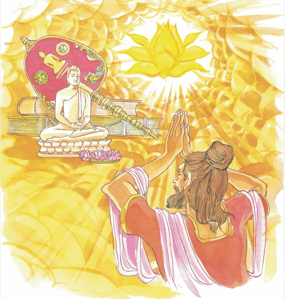 Now this was the day when all the dwellers in Anga and in Magadha and in the country of the Kurus were accustomed to come with rich offerings. When, therefore, they approached with their offerings, and saw that all those sages had become monks, they thought to themselves, “Is our brāhmin Aggidatta great, or is the monk Gotama great?” And because the Buddha had but just arrived, they concluded, “Aggidatta alone is great.” The Buddha surveyed their thoughts and said, “Aggidatta, destroy the doubt that exists in the minds of your disciples.” Aggidatta replied, “That is the very thing I desire to do.” So by superhuman power he rose seven times in the air, and descending to the ground, he saluted the Buddha and said, “Venerable, you are my Teacher and I am your disciple.” Thus did Aggidatta speak, declaring himself the disciple of the Buddha.