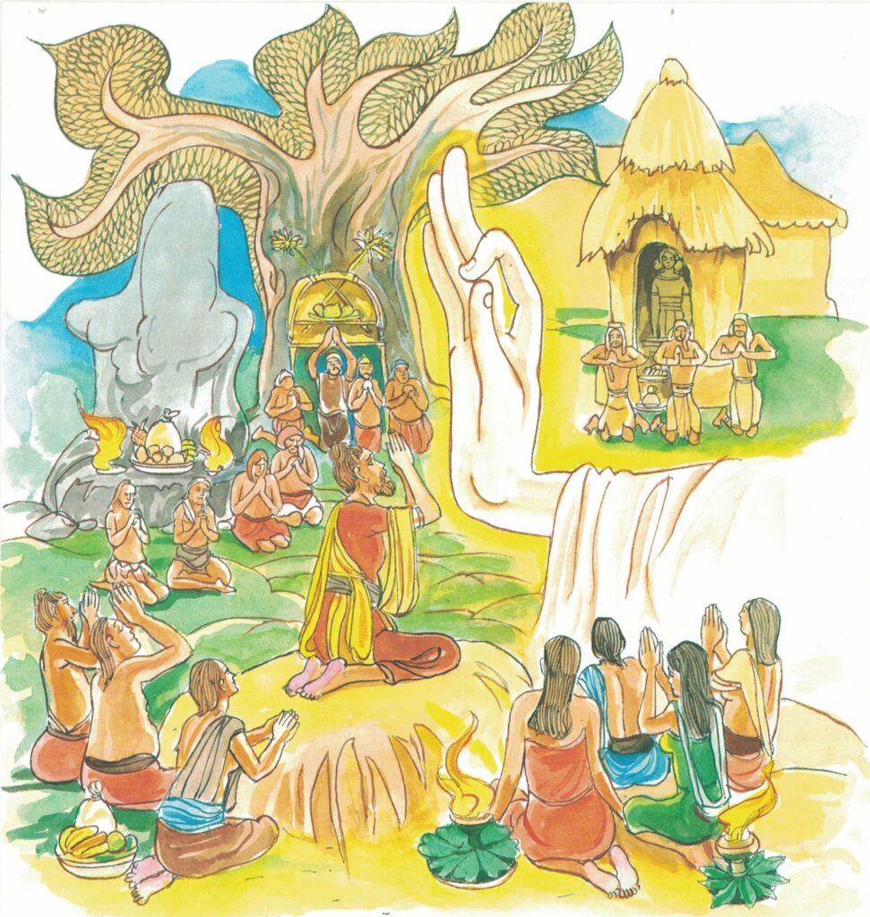 At that moment, the Buddha drew near. The Venerable, seeing the Buddha, arose and saluted him. Said the sages to the Venerable, “Is this man greater than you?” The Venerable replied, “This is the Buddha; I am only his disciple.” The Buddha seated himself on the summit of the pile of sand. The company of sages said to each other, “If such is the supernatural power of a mere disciple, what must the supernatural power of this man like?” And, extending their clasped hands in an attitude of reverent salutation, they bestowed praise on the Buddha. The Buddha said to Aggidatta, “Aggidatta, in giving admonition to your disciples and supporters, how do you admonish them?” Aggidatta replied, “I admonish them thus, ‘Seek refuge in this mountain, seek refuge in this forest, or grove, or tree. For he who seeks refuge in these obtains release from all suffering.’” The Buddha said, “No indeed, Aggidatta, he who seeks refuge in these does not obtain release from suffering. But he who seeks refuge in the Buddha, the Dhamma, and the Sangha, he obtains release from the round of suffering.”
