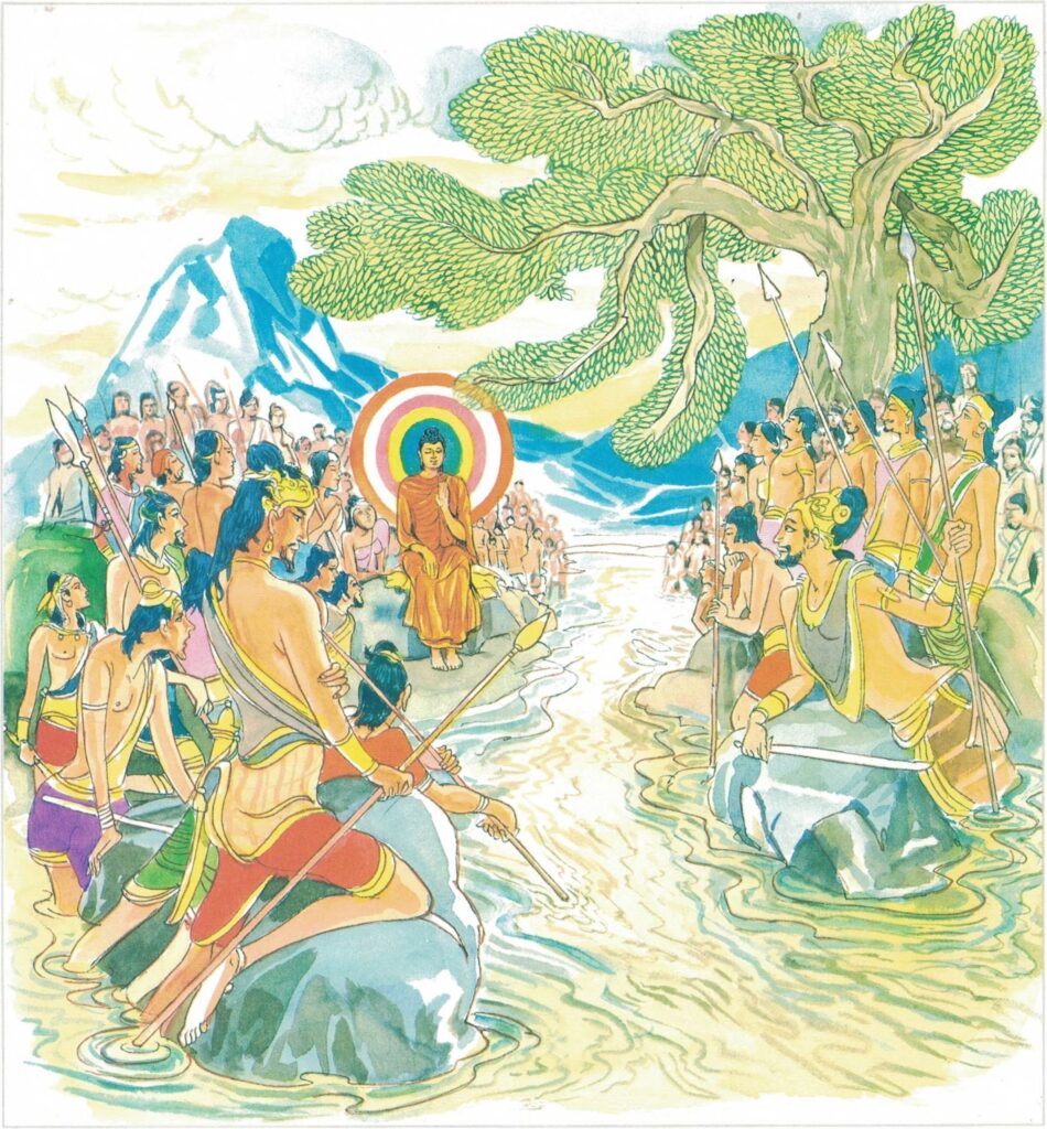 As the Buddha surveyed the world at dawn and beheld his kinsmen, he thought to himself, “If I refrain from going to them, these men will destroy each other. It is clearly my duty to go to them.” Accordingly he flew through the air quite alone to the spot where his kinsmen were gathered together, and seated himself cross-legged in the air over the middle of the Rohinī River. When the Buddha’s kinsmen saw the Buddha, they threw away their weapons and did reverence to Him. Said the Buddha to His kinsmen, “What is all this quarrel about, great king?” ‘We do not know, Venerable.” “Who then would be likely to know?” “The commander-in-chief of the army would be likely to know.” The commander-in-chief of the army said, “The viceroy would be likely to know.” Thus the Buddha put the question first to one and then to another, asking the slavelabourers last of all. The slave-labourers replied, “The quarrel is about water.”