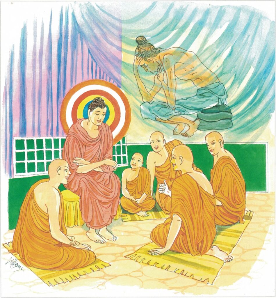 After the meal was over the Buddha handed over the bowl to the king, and, accompanied by His two chief disciples, entered the chamber of Yasoddharā, and sat on a seat prepared for Him, saying, “Let the king’s daughter reverence me as she likes. Say nothing.” Hearing of the Buddha’s visit, she bade the ladies in the court wear yellow garments. When the Buddha took His seat, Yasoddharā came swiftly to Him and clasping His ankles, placed her head on His feet and reverenced Him as she liked. Demonstrating her affection and respect thus, she sat down with due reverence. Then the king praised her virtues and, commenting on her love and loyalty, said, “Lord, when my daughter heard that you were wearing yellow robes, she also robed herself in yellow; when she heard that you were taking one meal a day, she also did the same; when she heard that you had given up lofty couches, she lay on a low couch; when she heard that you had given up garlands and scents, she also gave them up; when her relatives sent messages to say that they would maintain her, she did not even look at a single one. So virtuous was my daughter.”