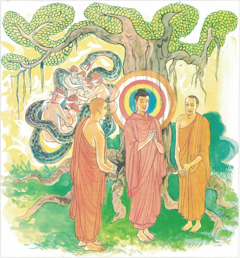Then the Buddha asked the king, “How much is water worth, great king?” “Very little, Venerable.” “How much are Sākyas worth, great king?” “Sākyas are beyond price, Venerable.” “It is not fitting that because of a little water you should destroy Sākyas who are beyond price.” They were silent. Then the Buddha addressed them and said, “Great kings, why do you act in this manner? Were I not here present today, you would set flowing a river of blood. You have acted in a most unbecoming manner. You live in enmity, indulging in the five kinds of hatred. I live free from hatred. You live afflicted with the sickness of the evil passions. I live free from disease. I live free from the eager pursuit of anything.”