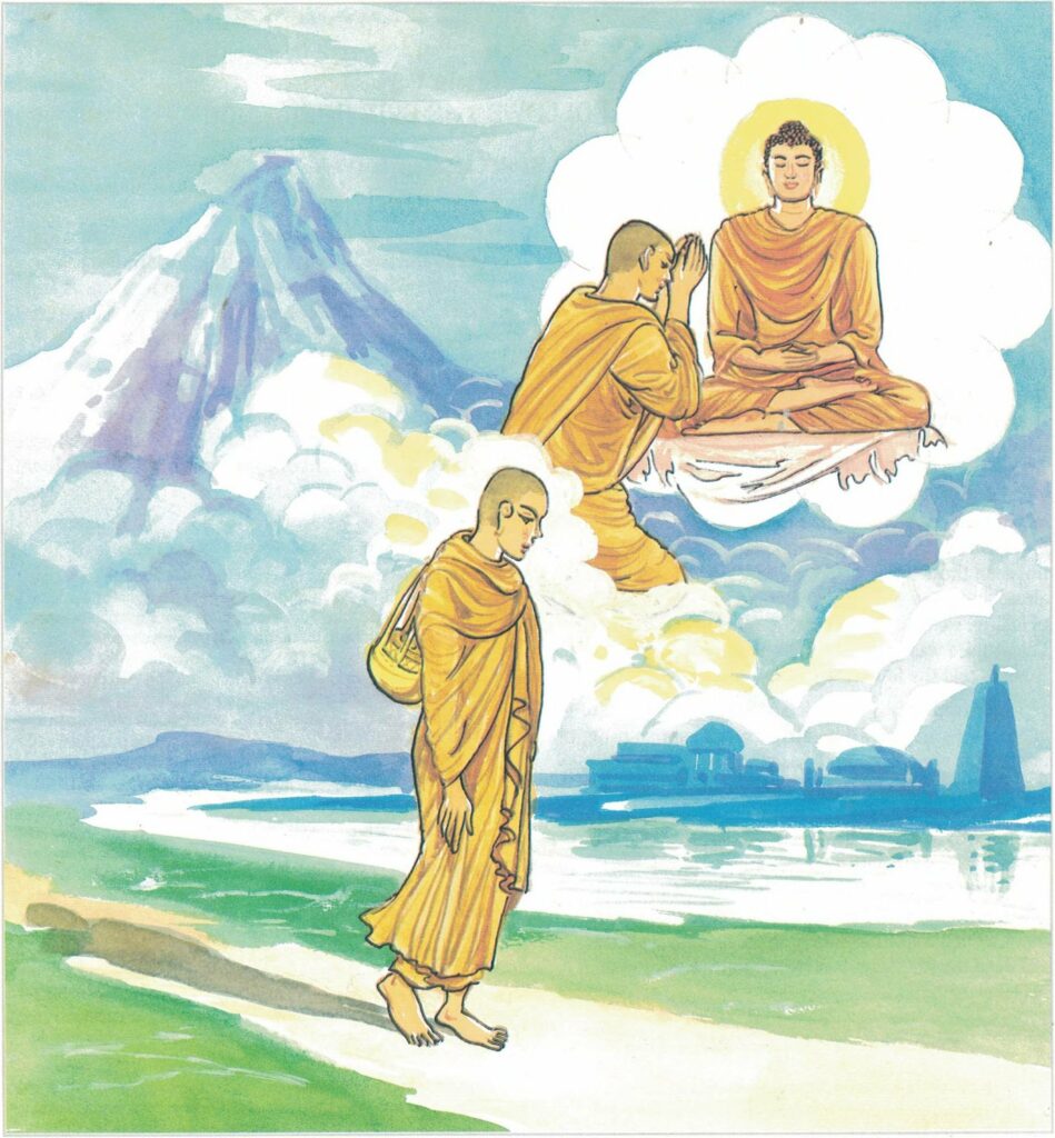 On that morning, the Buddha arising early from his deep meditation of compassion saw, in his Net of Knowledge, Maṭṭakuṇḍali lying on the verandah. So when entering Sāvatthi for alms-food with his disciples, the Buddha stood near the door of the Brāhmin Adinnapubbaka. The Buddha sent forth a ray of light to attract the attention of the youth, who was facing the interior of the house. The youth saw the Buddha; and as he was very weak he could only profess his faith mentally. But that was enough. When he passed away with his heart in devotion to the Buddha he was reborn in the Tāvatiṃsa celestial world.