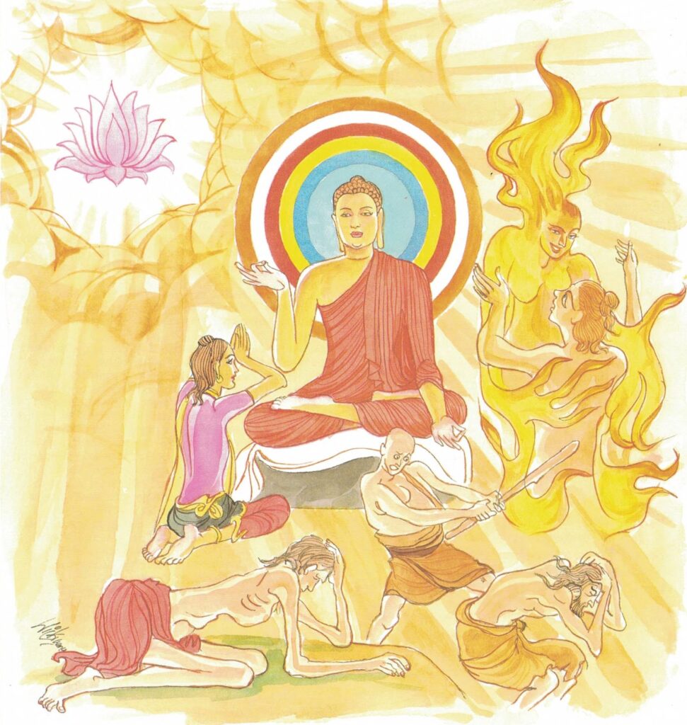 By his supernormal power, the Buddha willed that the bride would not be visible to the bridegroom. When the young man could no longer see the young woman, he could pay full attention to the Buddha, and his love and respect for the Buddha grew stronger in him. Then the Buddha said to the young man, “O young man, there is no fire like the fire of passion; there is no evil like anger and hatred; there is no ill like the burden of the five aggregates of existence (khandhās); there is no bliss like Nibbāna.” At the end of the discourse, both the bride and bridegroom attained sotāpatti fruition.