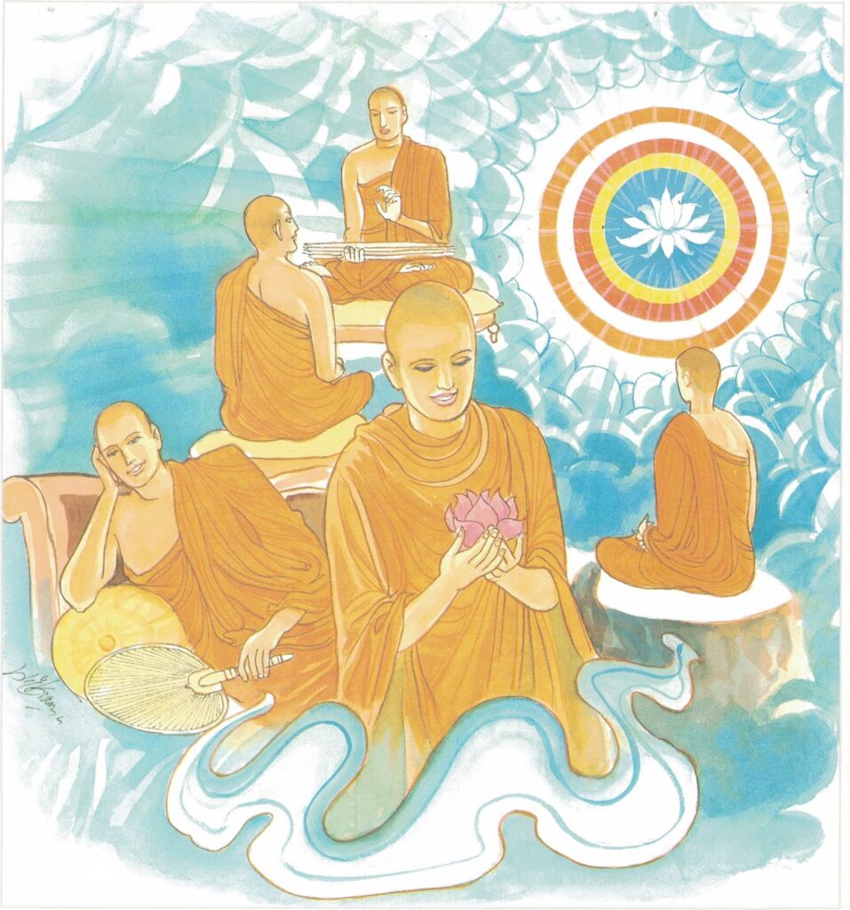 Having heard his explanation, the Buddha said to the monks, “Monks! Those who love and respect me should act like Tissa. You are not paying homage to me by just offering me flowers, perfumes and incense. You pay homage to me only by practicing the lokuttara Dhamma such as insight meditation.” At the end of the discourse, Venerable Tissa attained sotāpatti fruition.