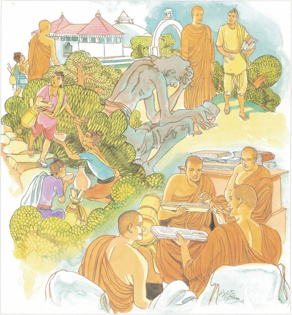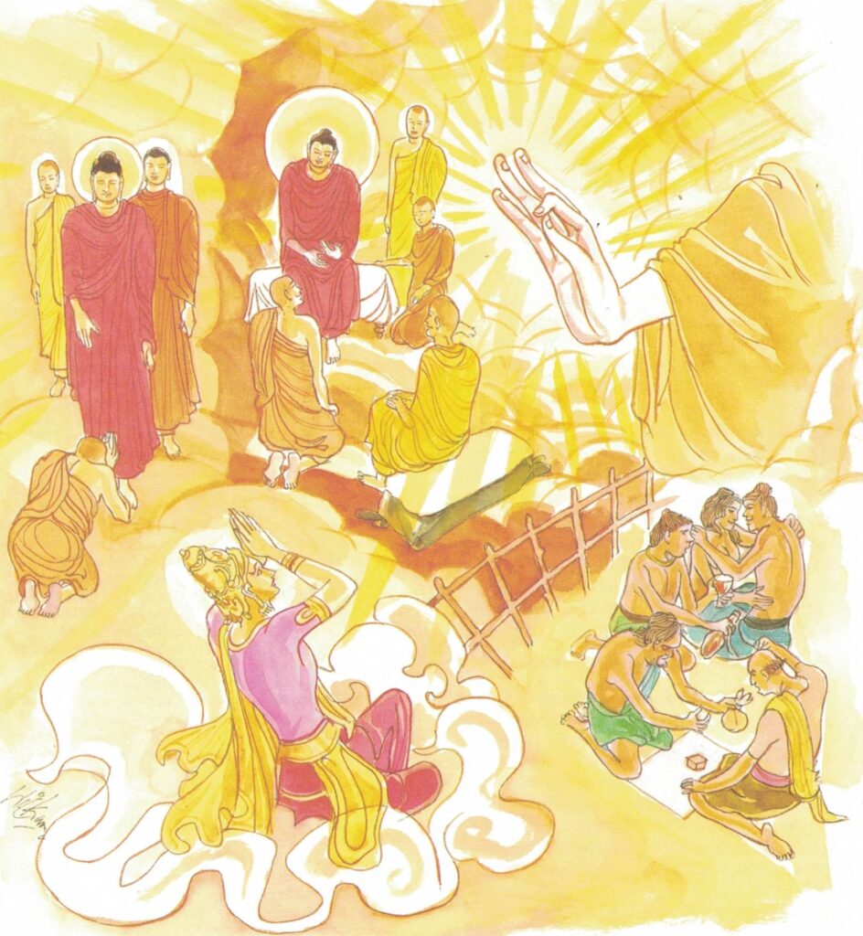 The Buddha’s illness: These three verses refer to the last days of the Buddha. When the Buddha was ill, Sakka came down from heaven to tend and nurse him. The Buddha’s illness, that led to his Great Demise, has been extensively recorded in Buddhist Literature. The Buddha was an extraordinary being. Nevertheless He was mortal, subject to disease and decay as are all beings. He was conscious that He would pass away in His eightieth year. Modest as He was, He decided to breathe His last not in renowned cities like Sāvatthi or Rājagaha, where His activities were centred, but in a distant and insignificant hamlet, like Kusinārā.