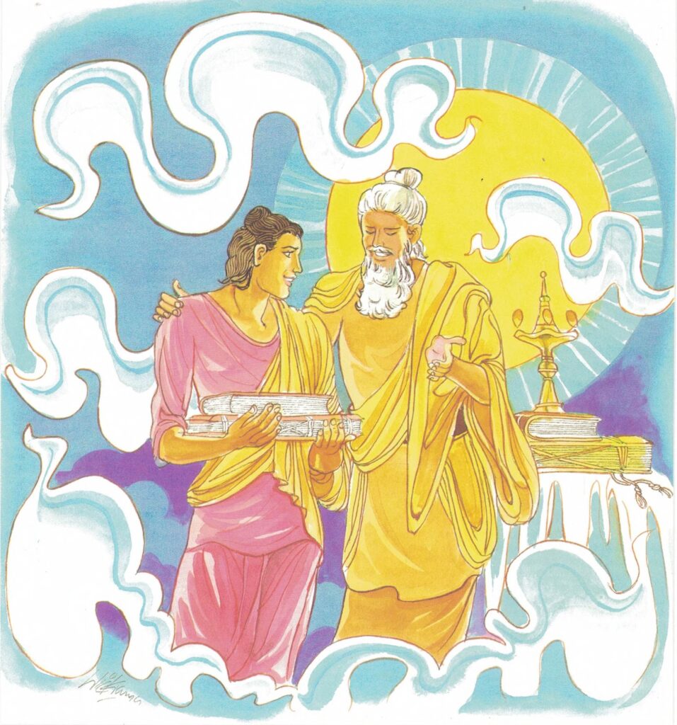 The monks began a discussion, saying, “Oh, how great must be the affection of Sakka for the Buddha! To think that Sakka should lay aside such heavenly glory as is his, to wait upon the Buddha in his sickness! To think that he should carry out on his head the vessel containing the excrement of the Buddha’s body, as though he were removing a vessel filled with perfumes, without the slightest contraction of the muscles of his mouth!” Hearing their talk, the Buddha said, “What say you, monks? It is not at all strange that Sakka king of gods should cherish warm affection for me. For because of me this Sakka king of gods laid aside the form of old Sakka, obtained the fruit of conversion, and took upon himself the form of young Sakka. For once, when he came to me terrified with the fear of death, preceded by the celestial musician Pañcasikha, and sat down in Indasāla Cave in the midst of the company of the gods, I dispelled his suffering by saying to him, “Vāsava, ask me whatever question you desire in your heart to ask; I will answer whatever question you ask me.” “Having dispelled his suffering, I preached the Dhamma to him. At the conclusion of the discourse fourteen billion of living beings obtained comprehension of the Dhamma, and Sakka himself, even as he sat there, obtained the fruit of conversion and became young Sakka. Thus I have been a mighty helper to him, and it is not at all strange that he should cherish warm affection for me. For, monks, it is a pleasant thing to look upon the noble, and it is likewise a pleasant thing to live with them in the same place; but to have aught to do with simpletons brings suffering.”