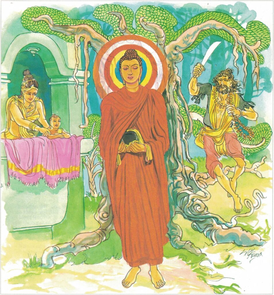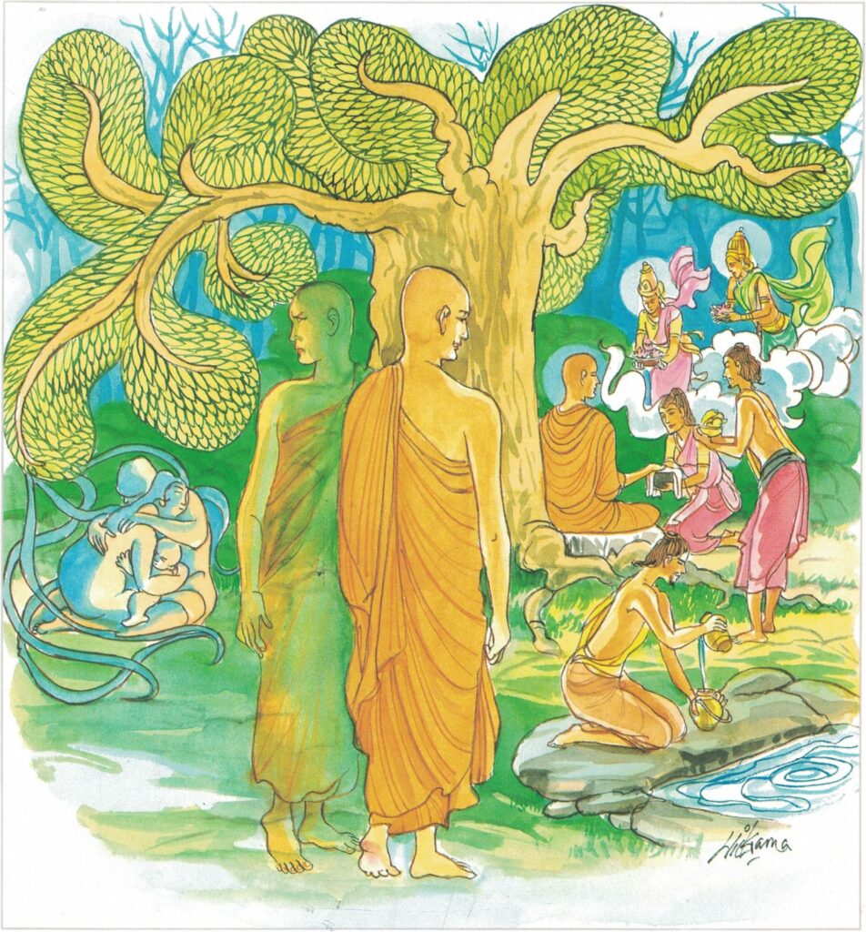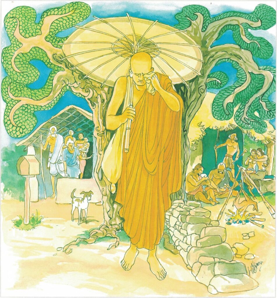 The story goes that in a certain household at Sāvatthi there was an only son who was the darling and delight of his mother and father. One day some monks were invited to take a meal at the house, and when they had finished they recited the words of thanksgiving. As the youth listened to the words of the Dhamma he was seized with a desire to become a monk, and straightaway asked leave of his mother and father. They refused to permit him to do so. Thereupon the following thought occurred to him, ‘When my mother and father are not looking, I will leave the house and become a monk.”
