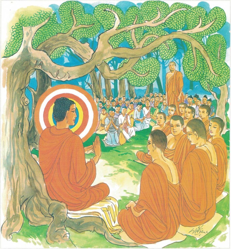 One day, on the occasion of a certain festival, as the Buddha, accompanied by the eight chief elders and a retinue of five hundred monks, was entering Rājagaha for alms, he saw five hundred youths with baskets of cakes on their shoulders come out of the city on their way to a pleasure garden. When they saw the Buddha, they saluted him and continued on their way without so much as saying to a single monk, “Have a cake.” When they had gone, the Buddha said to the monks, “Monks, would you not like to eat some cakes?” “Venerable, where are my cakes?” “Do you not see those youths passing by with baskets of cakes on their shoulders?” “Venerable, such youths as they never give cakes to anybody.” “Monks, although these youths have not invited you or me to share their cakes, yet a monk, the owner of the cakes, follows in the rear. You must eat some cakes before you go on.” Now the Buddhas cherish no sentiments of ill-will or hatred towards any man; therefore the Buddha spoke thus. And having thus spoken, he went with the congregation of monks, and sat down at the foot of a certain tree in the shade.