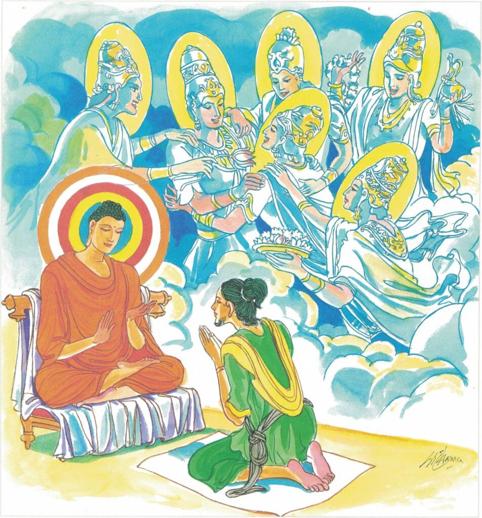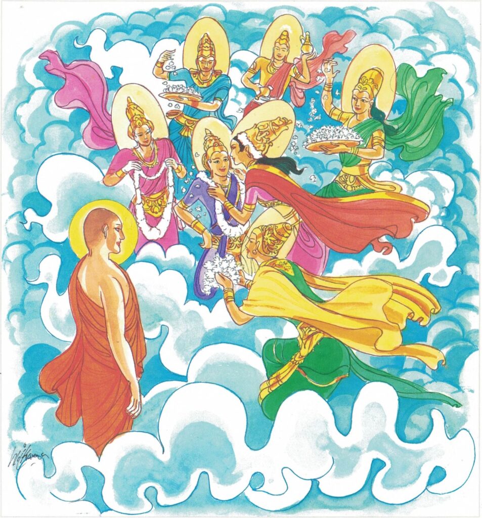 When Nandiya’s mother and father died, she became sole mistress of the household. Nandiya, having come into great wealth on the death of his mother and father, established alms for the congregation of monks, and likewise established at the door of his house regular distribution of cooked food to poor folk and travellers. Somewhat later, after hearing the Buddha preach the Dhamma considering within himself the blessings which would accrue to him through the gift of a dwelling to the monks, he caused a quadruple hall, a four chambered hall to be erected and furnished at the Great Monastery of Isipatana. And having caused beds and couches to be spread, presented this dwelling to the congregation of monks presided over by the Buddha, giving alms, and pouring water of donation into the right hand of the Buddha. As the water of donation fell into the right hand of the Buddha, there arose in the world of the thirtythree a celestial mansion extending twelve leagues in all directions, a hundred leagues high, made of the seven kinds of jewels and filled with celestial nymphs. One day when Venerable Mahā Moggallāna went on a pilgrimage to the world of the deities, he stopped near this palace and asked some deities who approached him, “Through whose merit came into existence this celestial mansion filled with a company of celestial nymphs?” Then those deities informed him who was lord of the mansion, saying, “Venerable, a householder’s son named Nandiya caused a monastery to be erected at Isipatana and gave it to the Buddha, and through his merit this celestial mansion came into existence.” Thereupon the company of celestial nymphs descended from that palace and said to the elder, “Venerable, we would be the slaves of Nandiya. Although we have been reborn here, we are exceedingly unhappy because we do not see him; pray tell him to come here. For putting off human estate and taking the estate of a deity, is like breaking a vessel of clay and taking a vessel of gold.” The elder departed thence, and approaching the Buddha, asked him, “Venerable, is it true that while men yet remain in the world of men, they attain heavenly glory as the fruit of the good works which they have performed?”