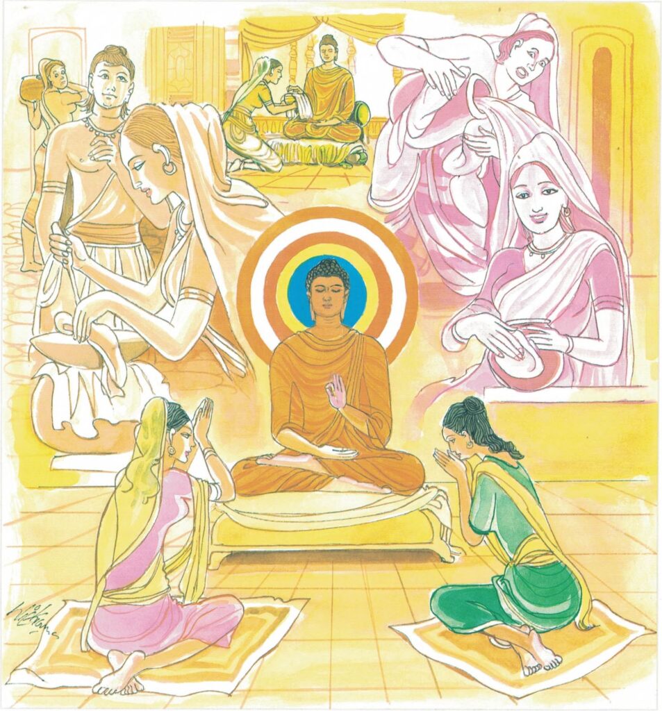 Uttarā was the daughter of a farm labourer named Puñña and his wife. Puñña worked for a rich man named Sumana, in Rājagaha. One day, Puñña and his wife offered alms-food to Venerable Sāriputta soon after his arising from sustained deep mental absorption (nirodha samāpatti), and as a result of that good deed they suddenly became very rich. Puñña came upon gold in the field he was ploughing, and the king officially declared him a royal banker. On one occasion, the family of Puñña offered alms-food to the Buddha and the monks for seven days, and on the seventh day, after hearing the Buddha’s discourse, all the three members of the family attained sotāpatti fruition. Later, Uttarā, the daughter of Puñña, married the son of the rich man Sumana. That family being non-Buddhist, Uttarā did not feel happy in her husband’s home. So, she told her father, “My father, why have you put me in this cage? Here, I do not see any monk and I have no chance to offer anything to any monk.” Her father felt sorry for her and sent her fifteen thousand in cash. With this money, after getting permission from her husband, Uttarā engaged a courtesan to look to the needs of her husband. So it was arranged that Sirimā, a wellknown and very beautiful courtesan, was to take her place as a wife for fifteen days.