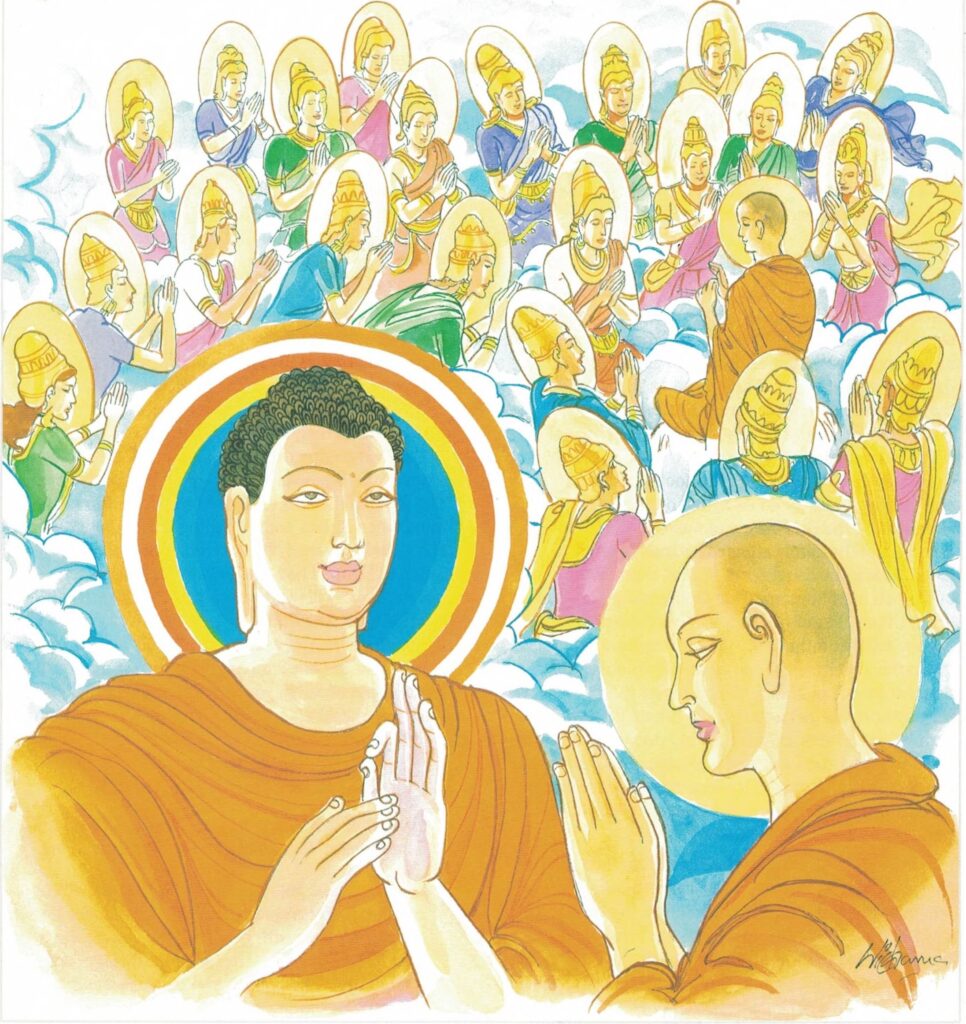 Once, Venerable Mahā Moggallāna visited the deva world and found many devas living in luxurious mansions. He asked them for what good deed they were reborn in the deva world and they gave him different answers. One of them was reborn in the deva world not because he gave away much wealth in charity or because he had listened to the Dhamma, but just because he always spoke the truth. The second one was a female deva who was reborn in the deva world because she did not get angry with her master and had no ill will towards him even though he often beat her and abused her. For keeping her temper and abandoning hatred she was reborn in the deva world. Then, there were others who were reborn in the deva world because they had offered little things like a stick of sugar cane, a fruit, or some vegetables to a monk or to someone else.