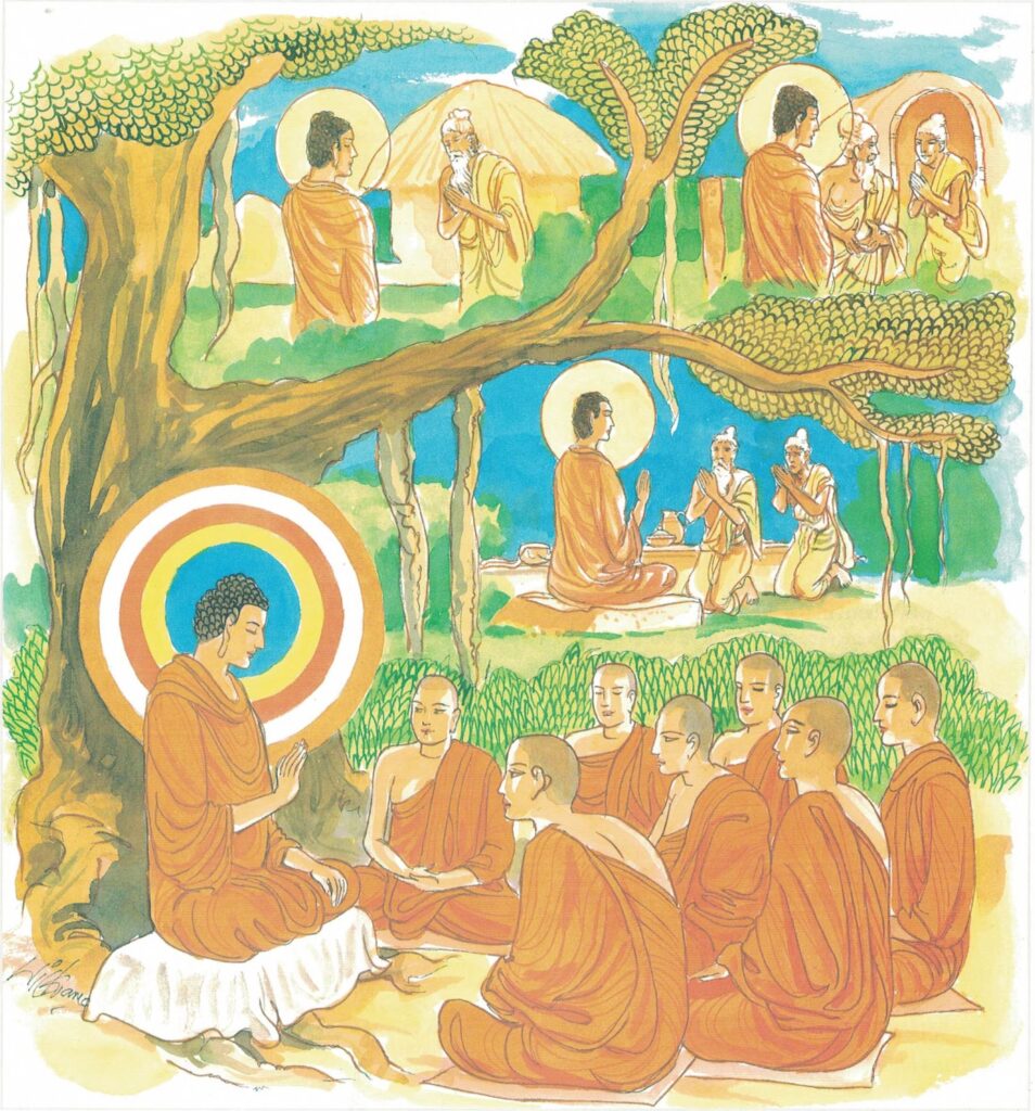 The following beautiful parable aptly illustrates the fleeting nature of life and its alluring pleasures. A man was forcing his way through a thick forest beset with thorns and stones. Suddenly, to his great consternation, an elephant appeared and gave chase. He took to his heels through fear, and, seeing a well, he ran to hide in it. But to his horror, he saw a viper at the bottom of the well. However, lacking other means of escape, he jumped into the well, and clung to a thorny creeper that was growing in it. Looking up, he saw two mice, a white one and a black one, gnawing at the creeper. Over his face there was a beehive from which occasional drops of honey trickled. This man, foolishly unmindful of this precarious position, was greedily tasting the honey. A kind person volunteered to show him a path of escape. But the greedy man begged to be excused’till he had enjoyed himself.