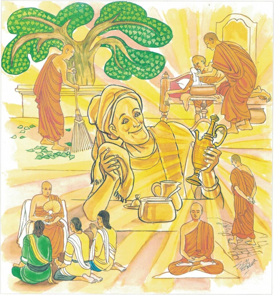At the conclusion of the meal he took the Buddha’s bowl to permit him to pronounce the words of thanksgiving. “Venerable,” said he, “as I stood in this place when the monks were putting on their robes and watched them, I saw this and that, and I did this and that.” And beginning at the beginning, he told the Buddha the whole story. The Buddha listened to his words and then said, “Brāhmin, a wise man by doing good works, time after time, little by little, gradually removes the stains of his own evil deeds.”
